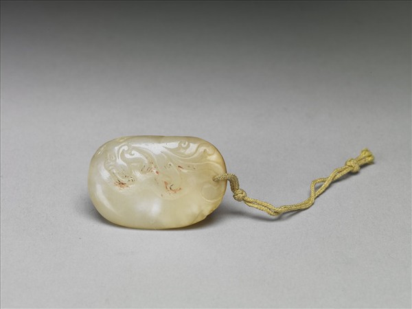玉質,局部帶黃斑。全器琢成一橢圓玉,表面雕一攀爬於玉身之異獸形狀。一端帶有一穿孔,附黃絛。