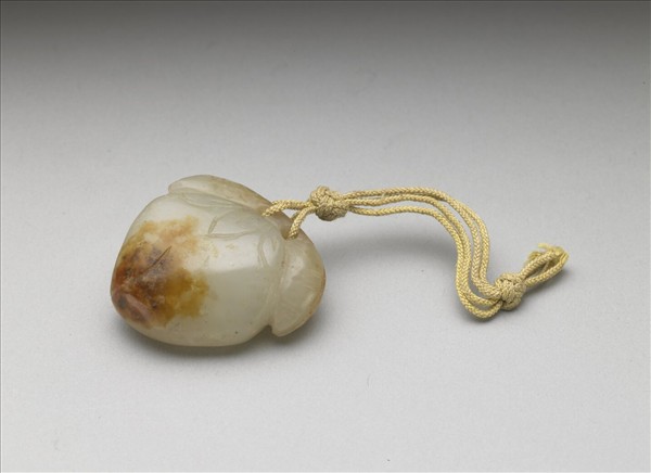 玉質,局部帶褐斑。全器琢成一桃實,頂端帶有兩葉片,雕飾簡潔線條。葉片中間有兩穿孔,繫帶鈕扣結之黃絛。