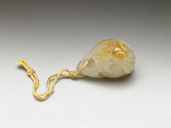 玉質,帶黃斑。全器琢成一不規則形果實,果身上連接數片葉脈分明的葉子,與利用玉質顏色琢成一昆蟲。頂端有一穿,繫帶有鈕扣結之黃絛。