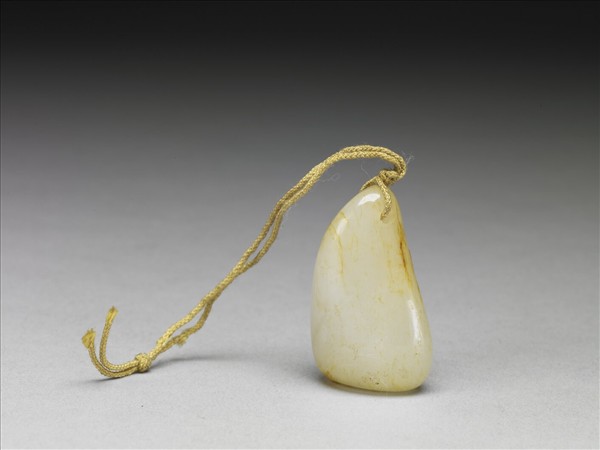玉質,帶綹。本器為天然籽料打一穿孔而成,表面光滑圓潤,無紋飾,繫帶鈕扣結之黃絛。