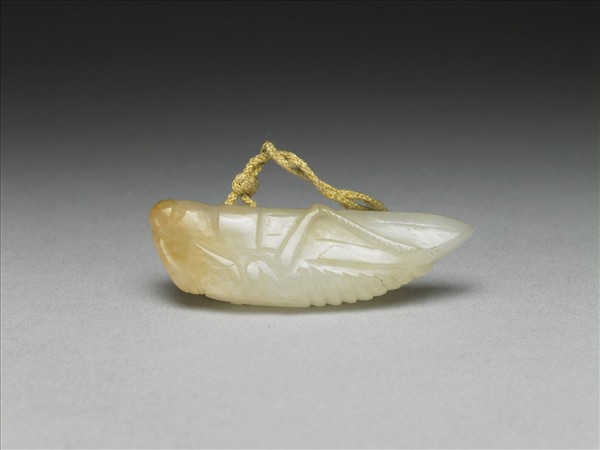玉質,局部泛黃。全器琢成一蝗蟲,蟲首、腹、足皆雕飾簡潔線條。蟲背部鑿有穿孔,繫帶有鈕扣結之黃絛。