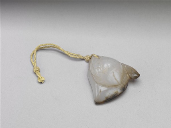玉質,局部帶褐斑。利用天然外形與顏色琢成桃實與葉片,桃頂端鑿一穿,繫帶有鈕扣結之黃絛。