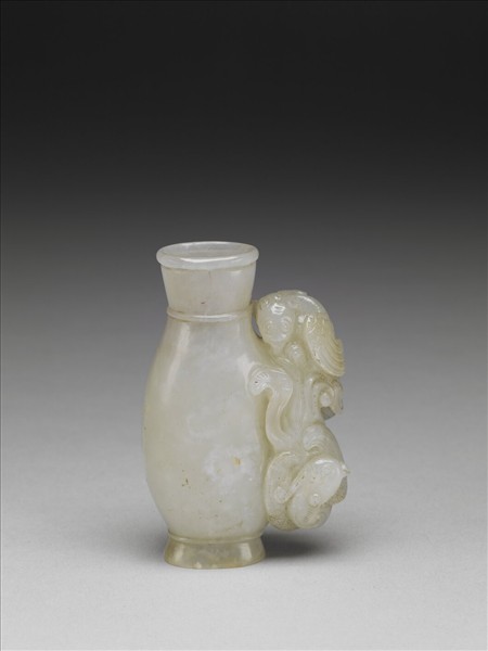玉質,全器主體琢成一玉瓶,器身扁平,侈口,唇沿,束頸,橢圓腹,撇圈足。頸與腹底各帶一圈弦紋。瓶側飾二禽鳥。
