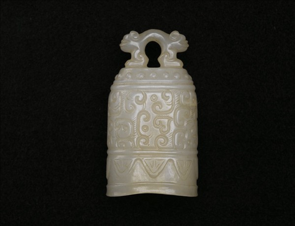 玉質,局部帶黃斑。全器琢成一玉鐘。鐘身呈扁圓形,頂端有一站立之獸作為把手,獸帶四足、雙首,長身軀。鐘外壁頂端飾一圈乳丁紋,腹飾獸紋,底飾蟬紋。
