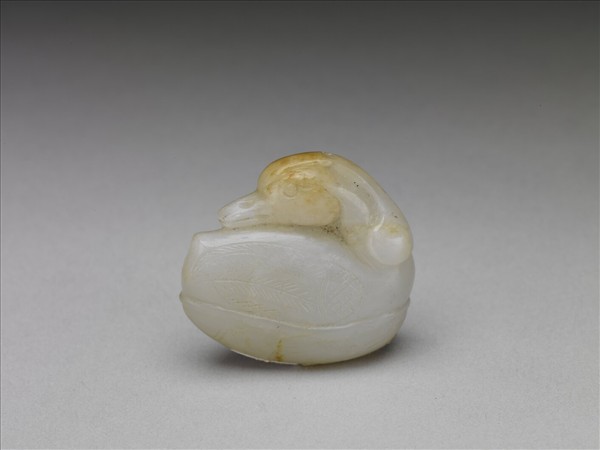 玉質,局部染褐沁。利用天然外形與顏色琢成一鴛鴦,首頂鑿一穿孔,鳥周身飾細膩之羽毛紋飾。