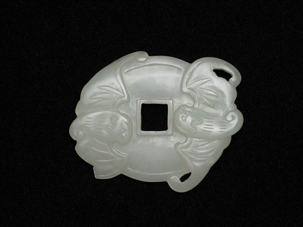 玉質,全器琢成一圓形錢幣,中央帶一方形穿孔。錢幣兩側帶有相對之展翅蝙蝠。錢幣另一面飾有兩字「五銖」。因「蝠」音同「福」,「錢」音同「前」,此器有「福在眼前」之吉祥意涵。