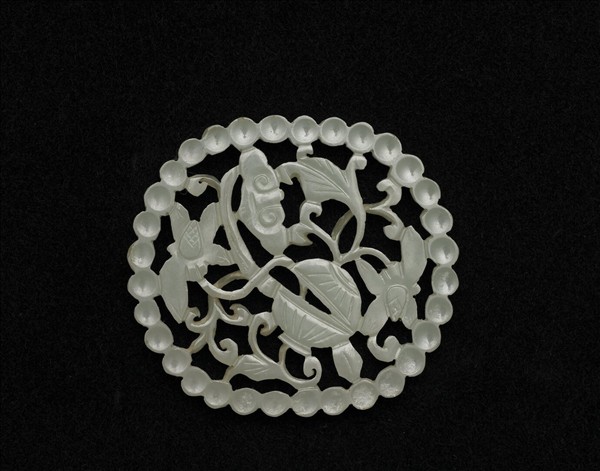 玉質,全器琢成一圓形玉飾,由相連圓珠串連成邊框,各圓珠中央處微凹。邊框內鏤雕帶蓋圓盒,周圍環繞兩朵花卉,並有枝葉與靈芝,象徵和合二仙。背面平素無紋。