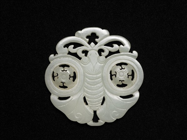 玉質,全器琢成一蝴蝶形玉牌,蝶身前翅部份以兩鏤空圓環取而代之,環內有變形柿蒂紋。蝴蝶兩觸角間與後翅間皆連有一幾何形橫槓,可供穿繫繩子。此玉牌雙面皆雕刻同樣紋飾。