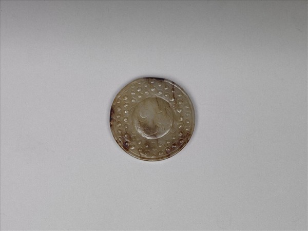 玉質,雜赭斑。劍首即裝於劍把頂端的飾物,一面光素,上有圓凹痕與點狀凹痕,用於固定劍具,另面中央圓凹開光,飾三道卷雲紋,外圈滿飾穀紋。