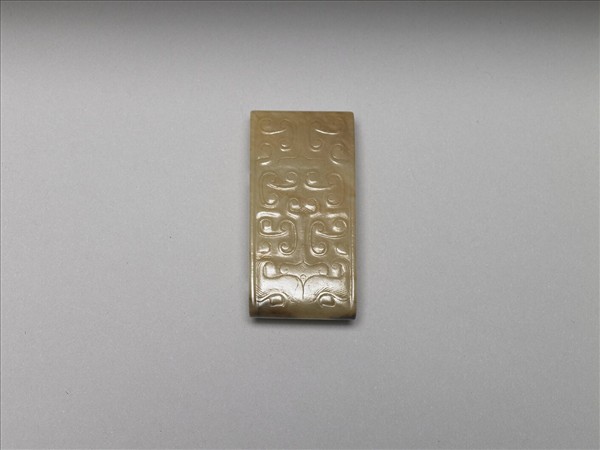 玉質,色白泛褐。頂面雕獸面、雲紋,兩端卷邊。下端連長方形穿,以利穿附於劍上。