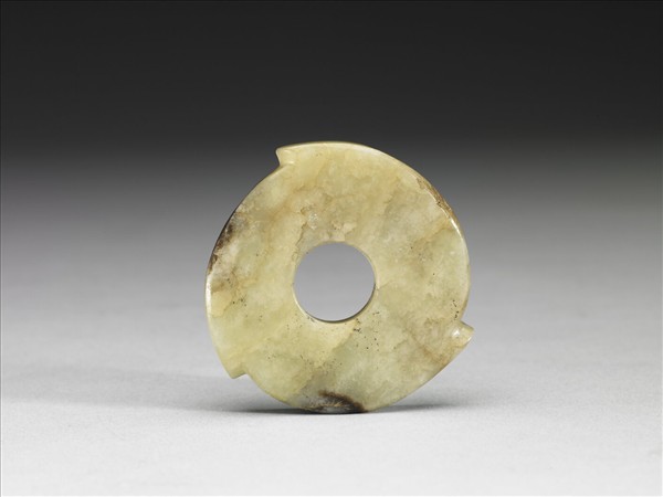 玉質,白色雜赭斑。整器光素無紋,中有圓孔,邊廓弧出三角。