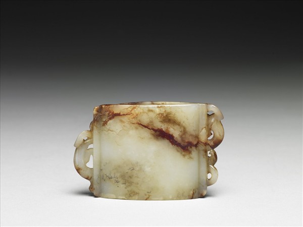 玉質,白色雜赭斑,狹長扁管形,外壁光素無紋,兩側各鏤雕一螭攀附其上。