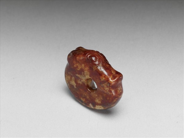 崧澤文化晚期至良渚文化早期流行雕琢這類有短立耳、寬鼻頭,捲曲身軀,好似某種「獸的胚胎」造形的玉雕。或是古人崇拜神秘的生命力,相信胚胎最具成長、變化的能力,故以美玉雕琢佩戴。這件遠古的小玉器,可能在明晚期至清初,被沁染呈褐色。