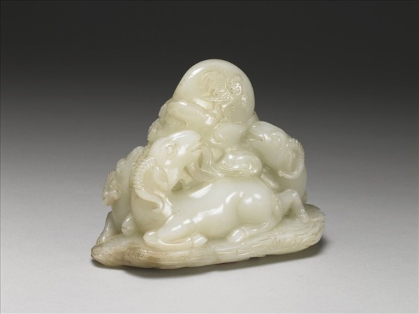 玉質,立雕三隻羊跪坐在草地上,抬頭向上望著圍繞在雲氣中的太陽,中間上方的圓球中浮雕一隻鳥,象徵金烏,也就是太陽,整組圖案意寓「三陽開泰」。附草木紋木座一只。