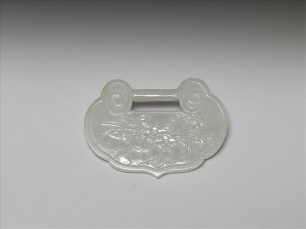 玉質,全器琢成一如意雲形鎖,一面浮雕梅花數朵與飛禽,鳥之冠、羽毛雕刻細膩。背面浮雕四字「無壽萬年」。