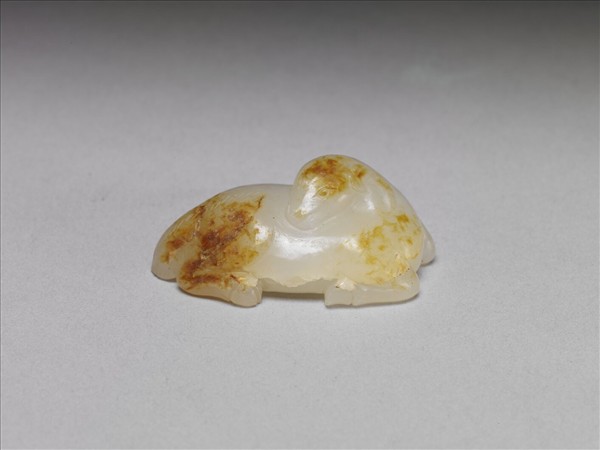 玉質,夾雜大片褐斑。全器琢成一回首蹲踞之羊,全身線條簡約,表面光素無紋,只刻畫出鬍鬚與背部些許毛髮。此羊為「三陽開泰」其中一件,與故玉6687、故玉6688、故玉6689為一組。置於故漆535之內。