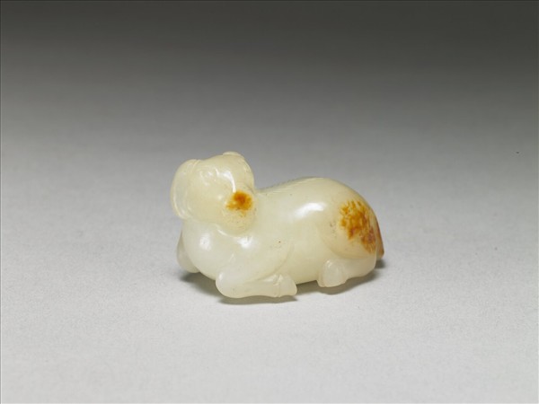 玉質,夾雜數處褐斑與黑點。全器琢成一呈回首蹲踞姿勢之羊,全身線條簡約,表面光素無紋,只刻畫出鬍鬚與背部些許毛髮。此羊為「三陽開泰」其中一件,與故玉6686、故玉6688、故玉6689為一組。置於故漆535之內。