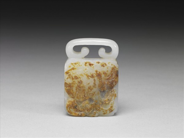 玉質,一面密佈赭斑,一面白淨無雜班。全器琢成一玉帶板,方形玉片之橫向開有扁平方孔,頂有一幾何形穿。帶紅斑面淺浮雕壽桃與蝙蝠,取其「福壽雙全」之吉祥意涵,背面光素無紋。