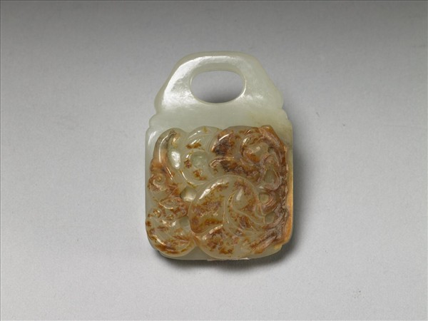 玉質,一面密佈紅褐色斑,一面白淨無雜班。全器琢成一玉帶扣,頂有一穿。帶紅斑面淺浮雕壽桃與蝙蝠,取其「福壽雙全」之吉祥意涵,背面光素無紋,中央雕一圓鈕。