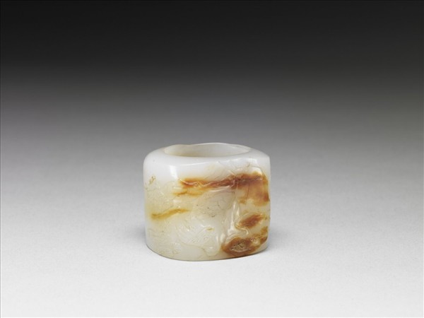 雕玉扳指的立面一側呈平面,三分之二呈弧形,以配合大拇指的形狀。扳指表面琢磨如岩壁,松樹旁立一鶴,石穴內一鹿伏臥,琢刻線條淺而鈍,再加上灰白玉質上的澄黃色帶,使扳指更顯古意。附黃籤,上書「仁宗」,推測為嘉慶時代作品。