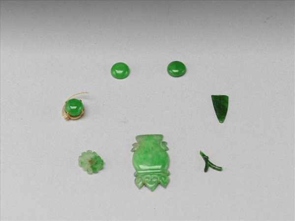 七件翠玉飾件(故玉6698-6702),三顆圓形翠綠玉珠,一顆鑲於金色座子。一片花形翠玉片。一片瓶形玉片。一支斷枝形玉片。另一片為半形葉片。