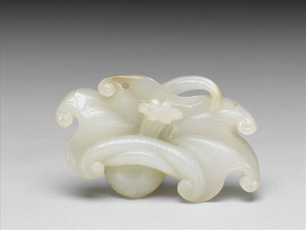 玉質純淨,玉墜雕琢呈花朵形,中心刻一蕊心,花瓣略向外翻卷。