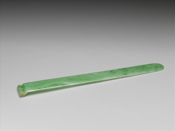 翠玉扁方,長而扁平,一端略折雕琢成花朵形。 扁方為滿族婦女梳旗頭時插飾的特殊大簪,將兩束頭髮纏繞其上成為一個橫髻,此類簪均作扁平一字形。
