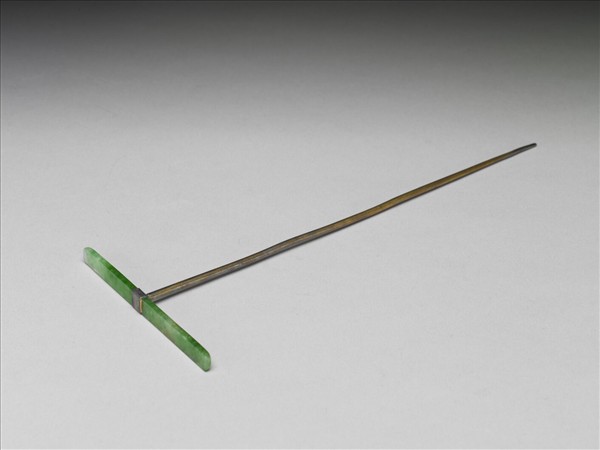 頭簪,主體銀製鍍金,簪首為一T字形翠玉,光素無紋,質地晶潤。