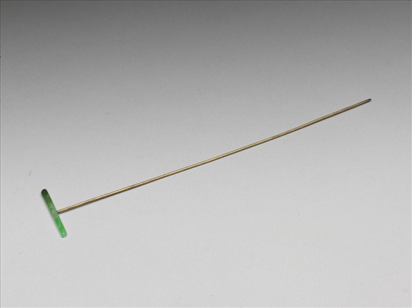 頭簪,主體銀製鍍金,簪首為一小塊長條翠玉,質地晶潤。