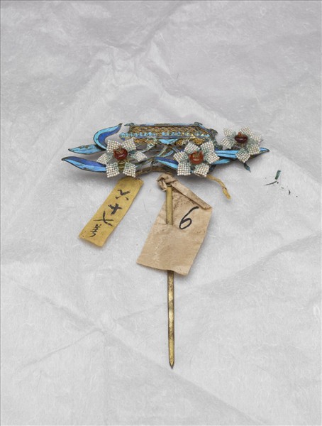 簪首以銀鍍金為框體,鑲米珠、翠羽製作成水仙盆花,部分脫落。