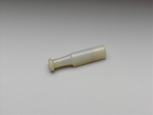 玉質煙嘴,帶赭斑,外壁光素無紋。全器以一塊長條狀玉石琢成,器身一段呈直筒狀,中空以容納煙管。另一段口沿處琢為圓餅狀,有穿直通筒狀器身,以就口吸煙。