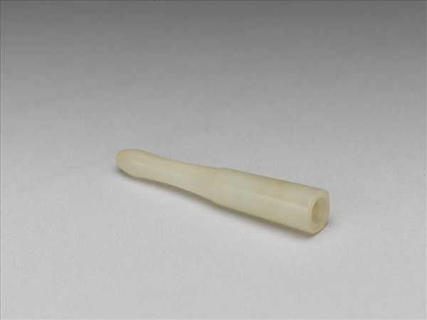 玉煙嘴,外壁光素無紋。器身一段呈直筒狀,中空以容納煙管。另一段口沿處琢為圓餅狀,有穿直通筒狀器身,以就口吸煙。附一錦袱。