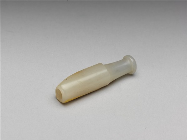 玉煙嘴,帶赭斑,外壁光素無紋。器身一段略近筒狀,中空以容納煙管。另一段口沿處琢為圓餅狀,有穿直通筒狀器身,以就口吸煙。附一錦袱。
