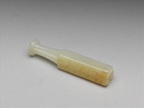玉煙嘴,帶赭斑,外壁光素無紋。器身一段略近筒狀,並琢雕出大塊平面以利置放,又中空以容納煙管。另一段口沿處琢為圓餅狀,有穿直通筒狀器身,以就口吸煙。