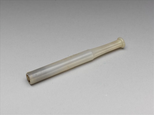 玉煙嘴,外壁光素無紋。器身一段直筒狀,中空以容納煙管。另一段口沿處琢為圓餅狀,有穿直通筒狀器身,以就口吸煙。