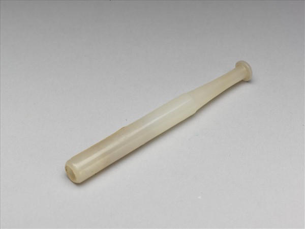 玉煙嘴,外壁光素無紋。器身一段直筒狀,中空以容納煙管。另一段口沿處琢為圓餅狀,有穿直通筒狀器身,以就口吸煙。