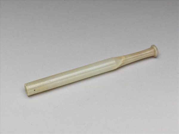 玉煙嘴,外壁光素無紋。器身一段直筒狀,中空以容納煙管。另一段口沿處琢為圓餅狀,有穿直通筒狀器身,以就口吸煙。