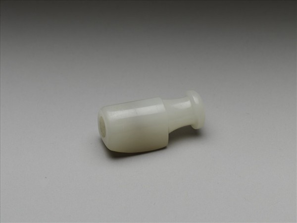 玉煙嘴,外壁光素無紋。器身一段略近筒狀,器壁一部份突出,並琢削為大塊平面,以利置放,中空以容納煙管。另一段口沿處外侈,有穿直通筒狀器身,以就口吸煙。