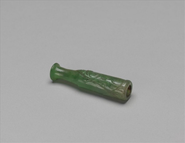 翠玉煙嘴。器身一段呈直筒狀,中空以容納煙管,筒狀器身外壁雕花草紋為飾。另一段口沿處琢為圓餅狀,有穿直通筒狀器身,以就口吸煙。附一錦袱。