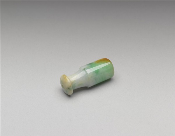 翠玉煙嘴,玉色綠、白、赭三色相雜,外壁光素無紋。器身一段呈直筒狀,中空以容納煙管。另一段口沿處琢為圓餅狀,有穿直通筒狀器身,以就口吸煙。