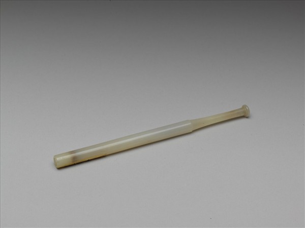 玉煙嘴,外壁光素無紋。器身一段直筒狀,中空以容納煙管。另一段口沿處琢為圓餅狀,有穿直通筒狀器身,以就口吸煙。