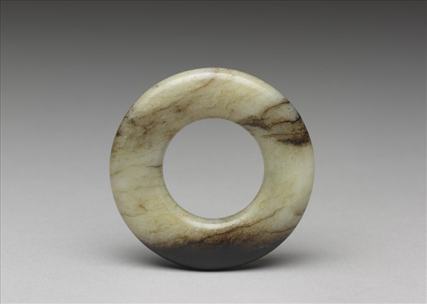 環形器,玉色白如凝脂,間雜深褐色的斑紋,打磨光潤。