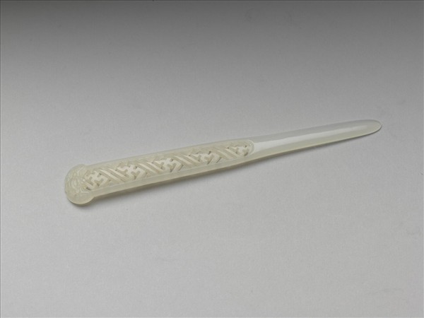 扁長形玉簪,簪首鏤雕卍字不斷錦地紋,簪首尾端略下折雕蝙蝠為飾,帶有「萬福」一類的吉祥意涵。