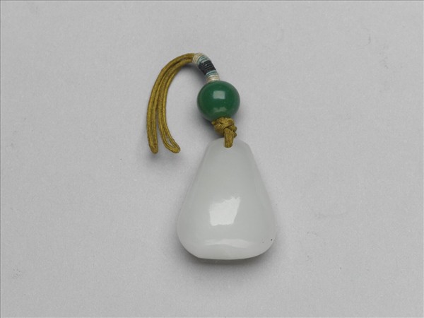 玉墜,略近水滴形,光素無紋。一端有穿,上以黃繩繫綠玉珠。