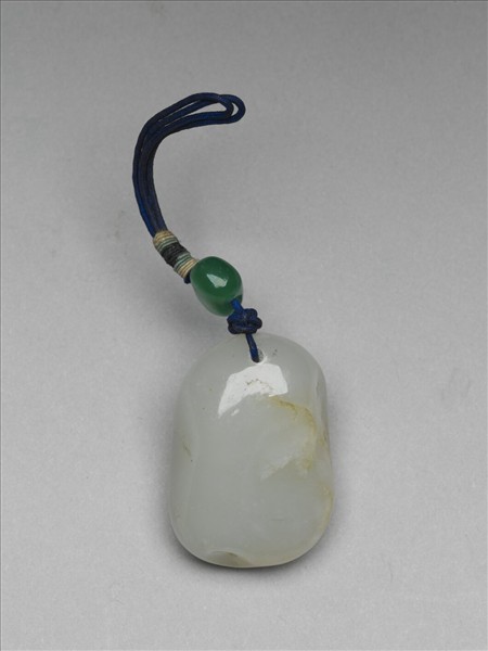 玉墜,形狀略近卵石,光素無紋。一端有穿,上以藍繩繫綠玉。