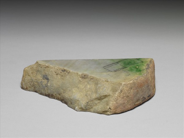 翠玉原石,色白中帶綠,上有切削過的大片平面,猶帶玉皮。面上有墨書:「光緒六年(1880)三月二十二日□号重三十兩卅一錢」,附黃色錦袱及布袋。