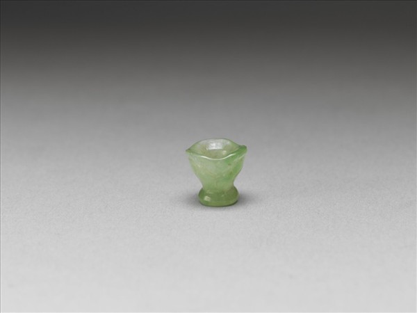 翠玉寶蓋,外型略如短圓錐狀體,上雕飾小葉瓣,並以簡單陰線紋表現出葉脈的效果。寶蓋一端挖空,可嵌飾其他小飾件,或穿繫珠串。