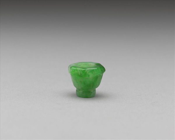 翠玉寶蓋,外型略如短圓錐狀體,上雕飾小葉瓣,並以簡單陰線紋表現出葉脈的效果。寶蓋一端挖空,可嵌飾其他小飾件,或穿繫珠串。