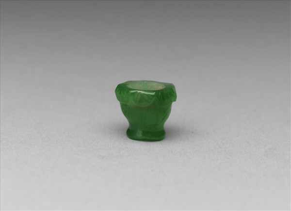 翠玉寶蓋,外型略如短圓錐狀體,上雕飾小葉瓣,並以簡單陰線紋表現出葉脈的效果。寶蓋一端挖空,可嵌飾其他小飾件,或穿繫珠串。