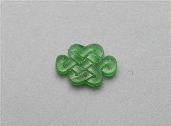 翠綠色片狀玉飾,全器雕為盤長狀,並就盤長交疊處作通心穿,彷彿盤長彎折自然形成之小空間,而這些小通心穿,也可以穿繫、固定於他器上,成為製作其他器物的配件。
